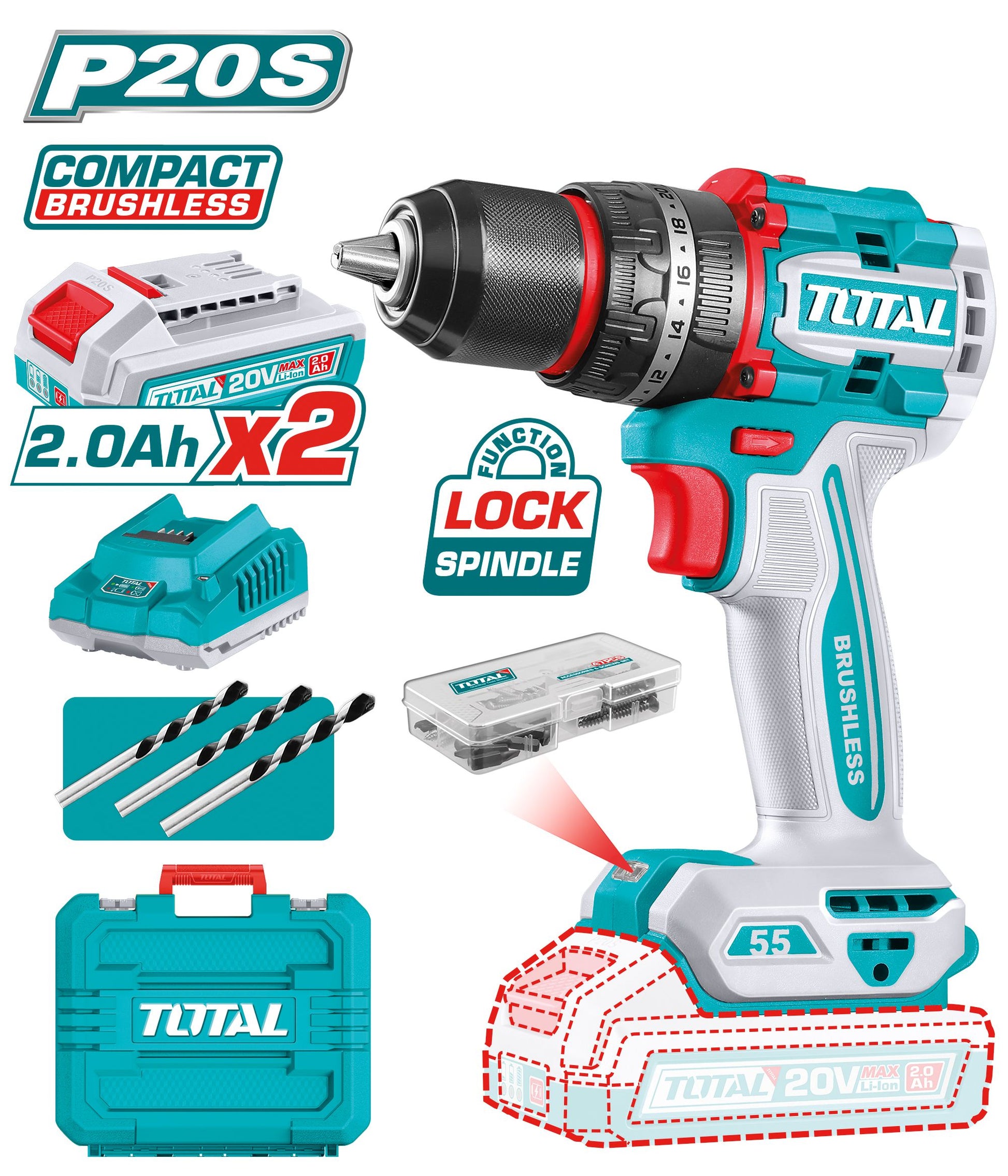 Berbequim com percussão sem escovas a bateria de 20 V. Motor sem escovas. Maximo par de aperto de 55 Nm. Mandril automático para metal com capacidade até 13 mm com 22 posições de aperto, uma para furação e outra para percussão. Velocidade de ralenti 0-500 / 0-2000 rpm. Taxa de impacto de 30.000 gpm. 2 velocidades e luz LED. Inclui duas baterias de 2Ah, carregador e acessórios. Inclui mala de transporte.